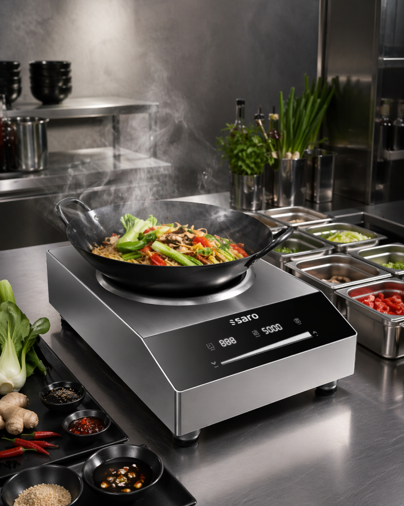 De Chios wok inductiekookplaat is ontworpen voor toepassingen waar hoge temperaturen en snelheid centraal staan.