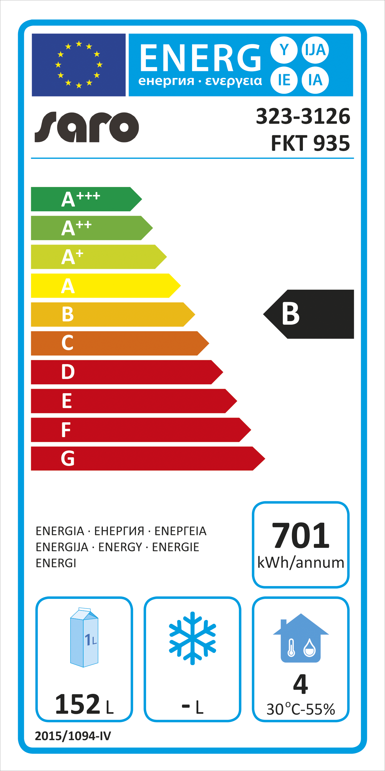 – Materiaal: (behuizing) staal geëmailleerd, wit; (interieur) kunststof, wit, (glasdeurkozijn) kunststof, zwart – Deur afsluitbaar, zelfsluitend, dubbel glas – 5 verstelbare roosters – LED binnenverlichting – Analoge temperatuurregeling – Statische koeling met circulatieventilator – Temperatuur 0 / +10 °C – Aansluiting: 230 V – 50 Hz – 0,180 kW – Roosters: 5x B 440 x…