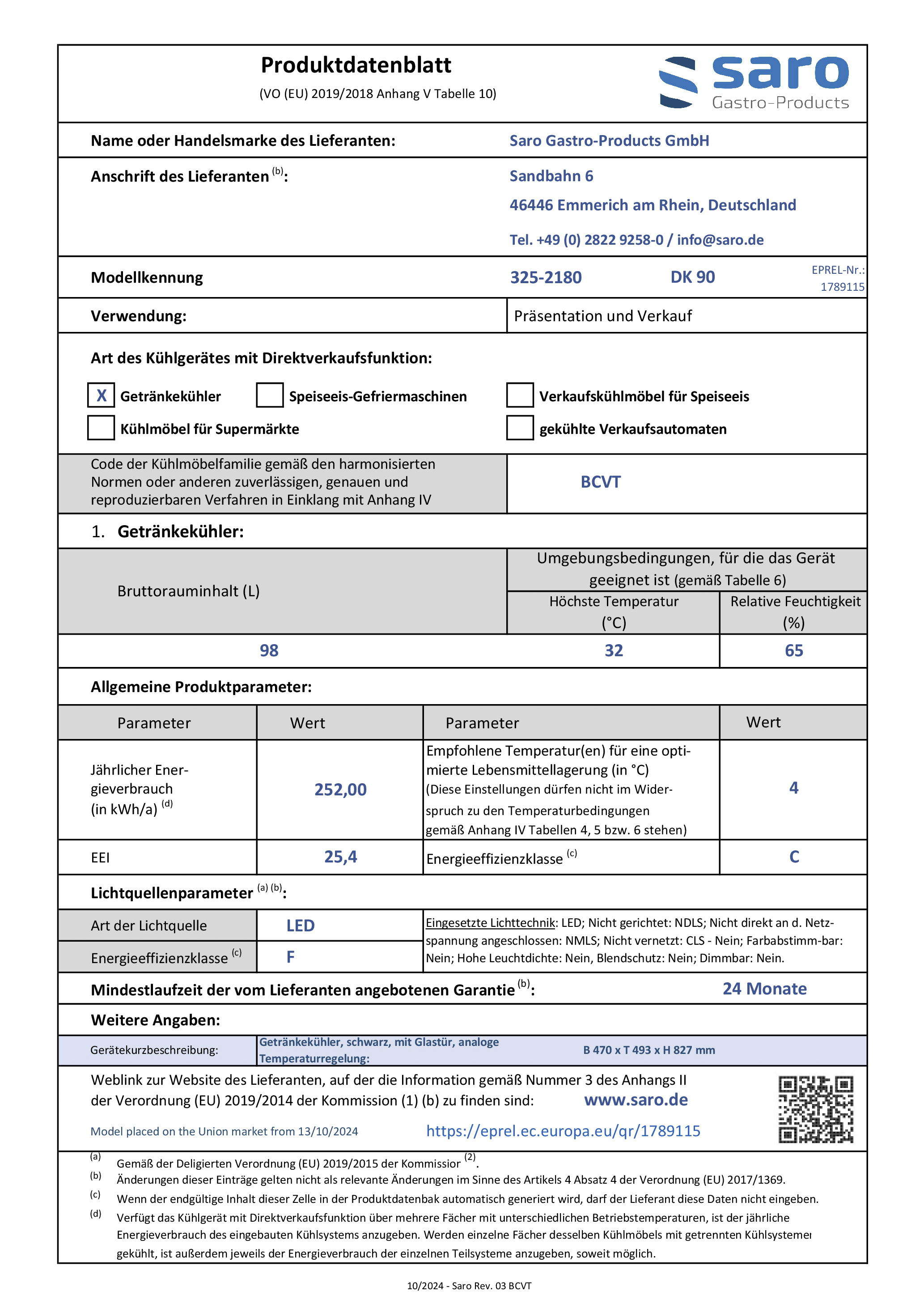 Hersteller: Saro Gastro-Products GmbH - Sandbahn 6 - 46446 Emmerich am Rhein - DEUTSCHLAND / GERMANY - info@saro.de - www.saro.de