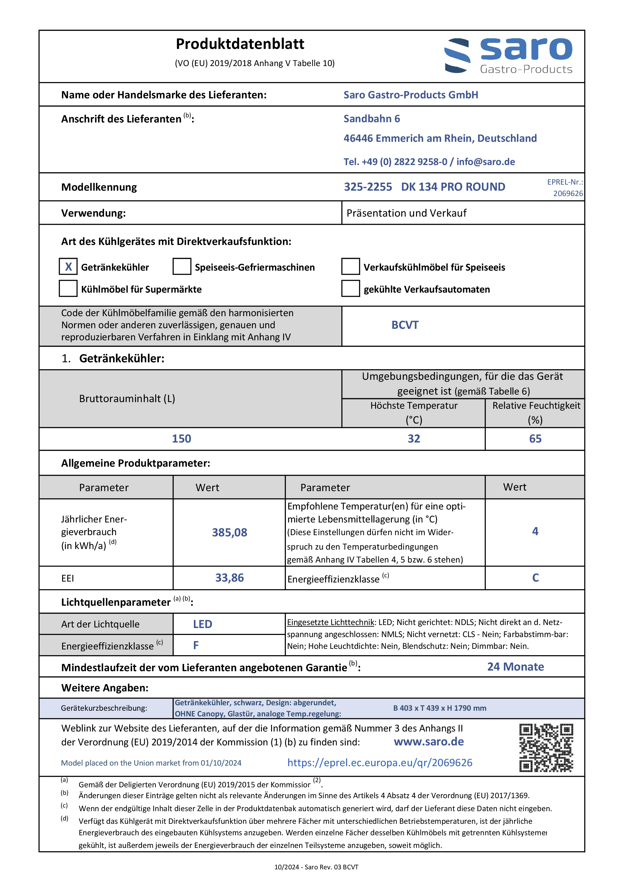 Hersteller: Saro Gastro-Products GmbH - Sandbahn 6 - 46446 Emmerich am Rhein - DEUTSCHLAND / GERMANY - info@saro.de - www.saro.de