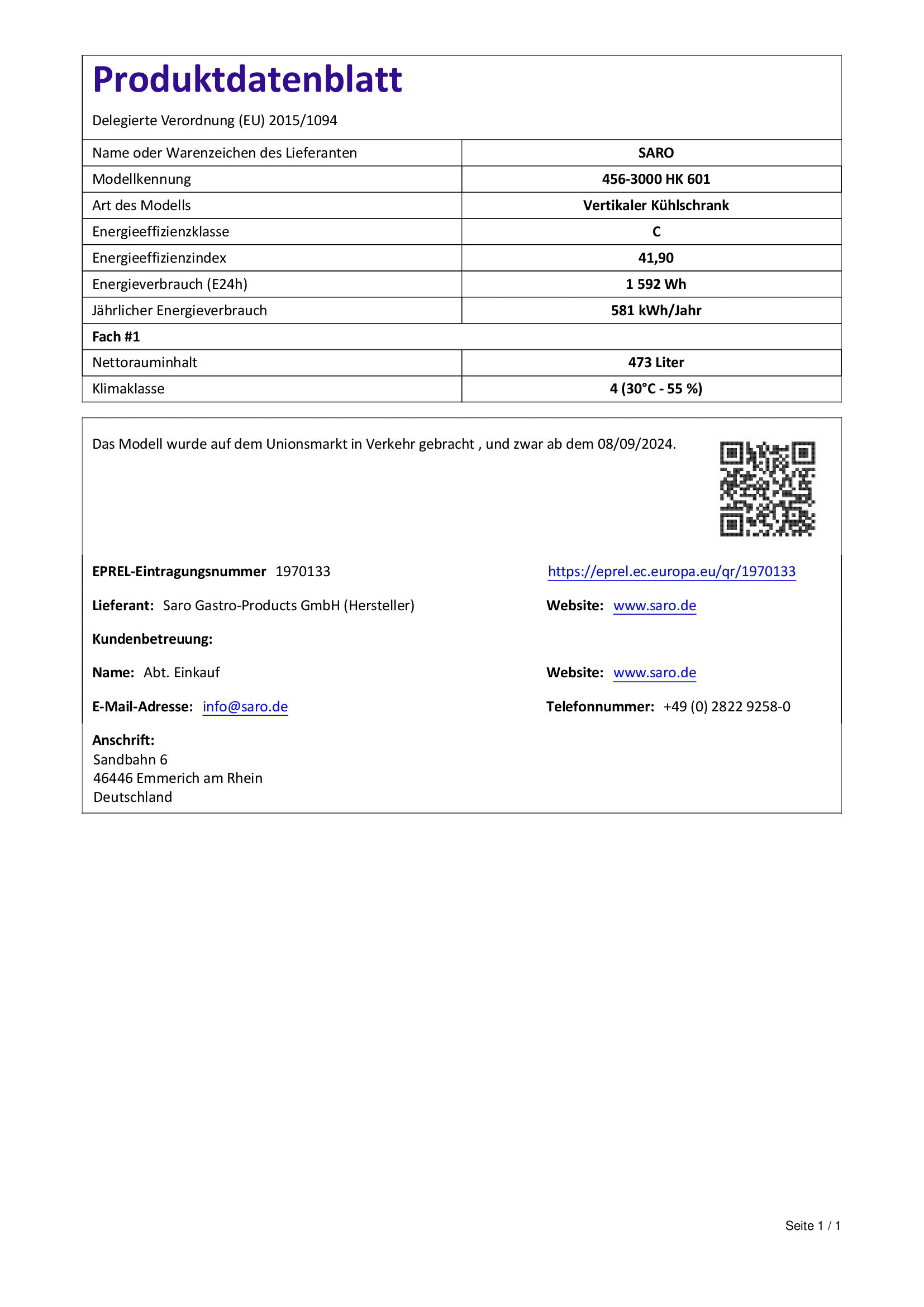 Hersteller: Saro Gastro-Products GmbH - Sandbahn 6 - 46446 Emmerich am Rhein - DEUTSCHLAND / GERMANY - info@saro.de - www.saro.de