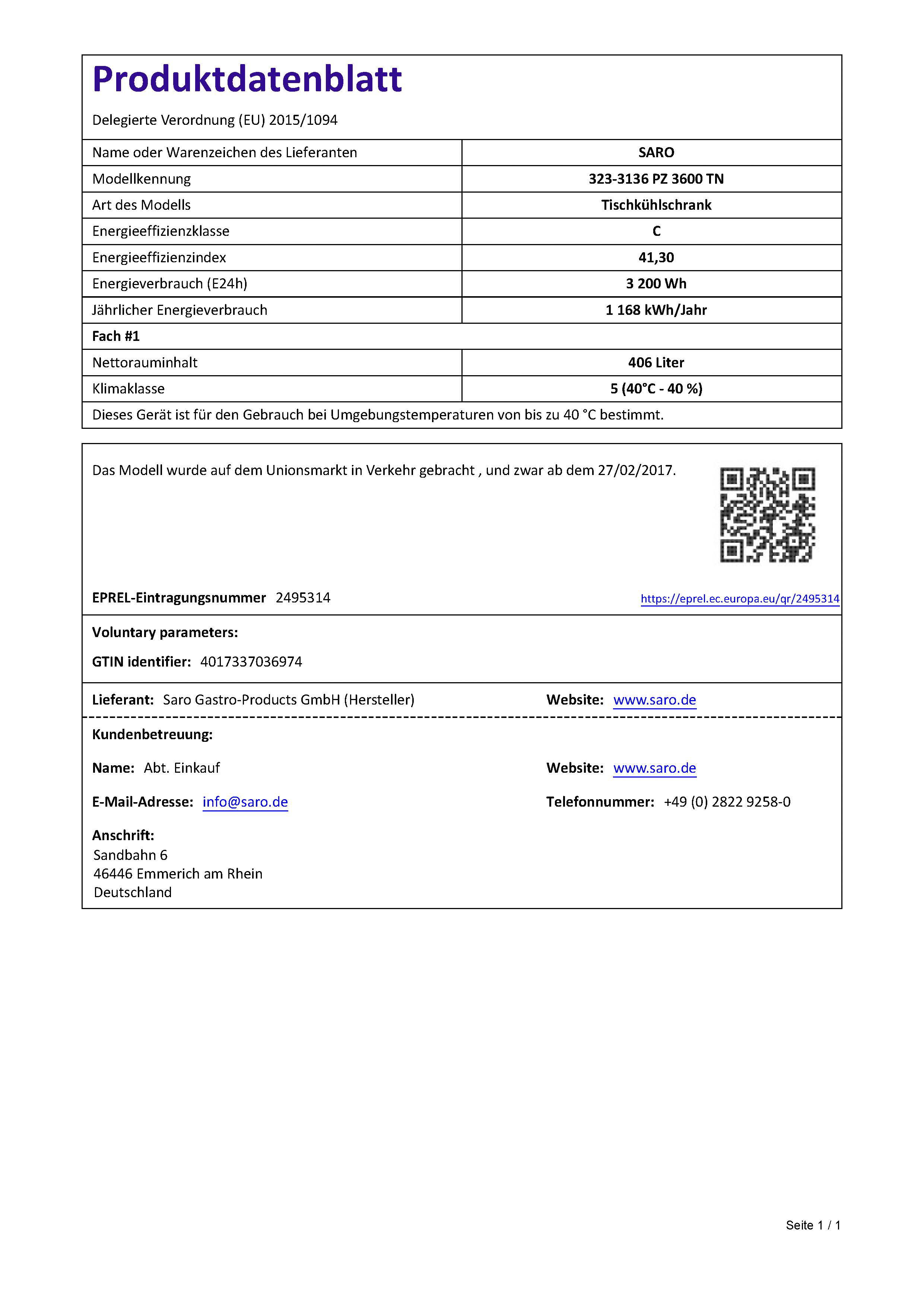 Hersteller: Saro Gastro-Products GmbH - Sandbahn 6 - 46446 Emmerich am Rhein - DEUTSCHLAND / GERMANY - info@saro.de - www.saro.de