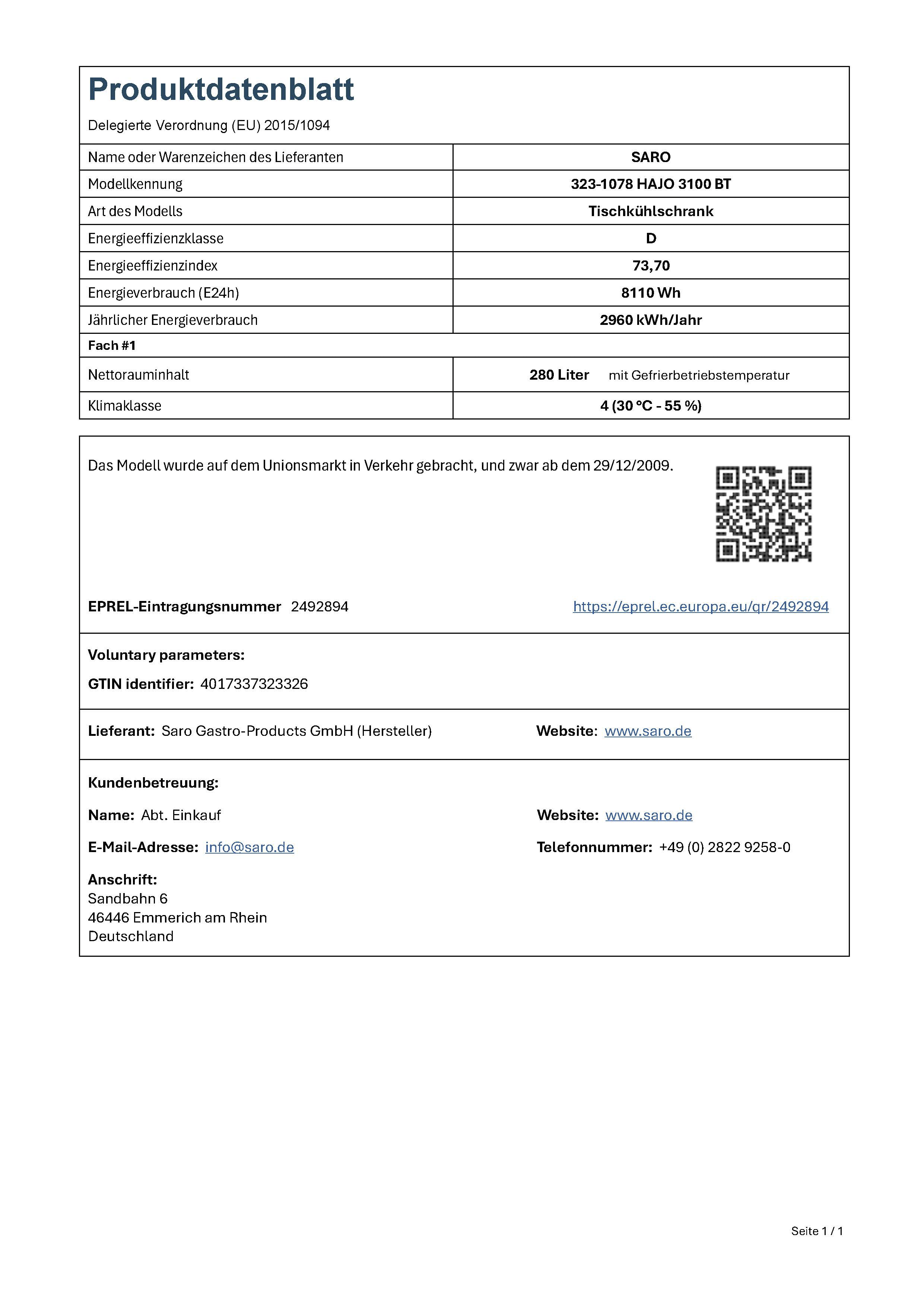 Hersteller: Saro Gastro-Products GmbH - Sandbahn 6 - 46446 Emmerich am Rhein - DEUTSCHLAND / GERMANY - info@saro.de - www.saro.de